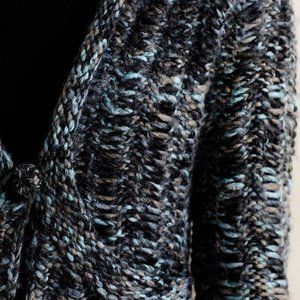 This is a super chunky knit sweater with yarn covered large button front closure. It's got an incredibly roomy hood and is super cozy. I will say I have no idea what they were thinking with the sleeves as they're very long and when uncuffed dangle about 4 inches past my finger tips but the sleeves are meant to be cuffed or meant to be 'zhuzhed up' a bit as seen in the Anthropologie photography.