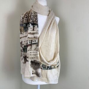 Anthropologie Hani Min Hand Painted Merino Wool Scarf Winter Visit Village Scene