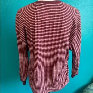 This pink and red striped 3/4 sleeve v-neck shirt is made by Anthropologie. This blouse has a textured fabric with a ribbed hem at the neckline and wrists. Good transitional piece. In good condition with no visible flaws, rips or stains. This blouse is thermal like. Care and fabric content tags have been removed. Made in Turkey, women's size small.