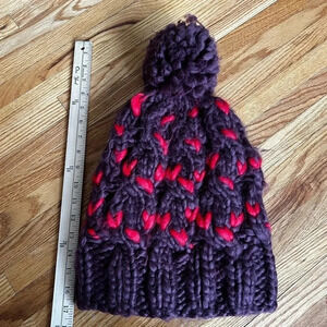 Anthropologie hat, one size fits all. Purple and red super chunky knit hat, this is a larger hat please see measurements. 100% acrylic- brand in silence+noise
