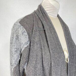 Long-sleeve cardigan with a draped open-front silhouette featuring patchwork mixed media paneling and zippered cuffs