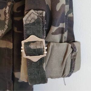 The Emma Jacket by Heartloom is a retro style camo jacket with lots of unique details. Silver metallic studs deck out two of the front pockets giving this distressed button up some fun flair. The full length sleeves can be rolled up to a 3/4 length and fastened with a silver buckle. Grey buttons bring this longer style jacket to a close. Elastic on each side of the bottom hemline allow anyone to wear this piece with ease. 98% cotton and 2% spandex