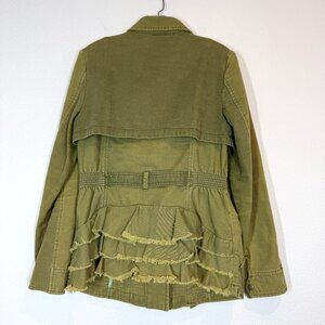 Stylish and versatile Anthropologie army green utility cargo jacket. Features a belted waist for a flattering fit, button front closure, shoulder epaulets, and multiple pockets for a functional yet chic look. Unique back detail with tiered raw-edge ruffles peplum gives it a feminine twist on a classic military jacket.