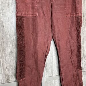 Anthropologie Hei Hei Linen Pants Roll Up Lace Embroidered Trim Rusted Red