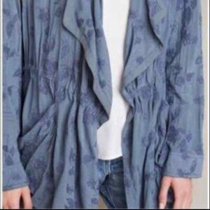 Anthropologie Hei Hei lightweight chambray kimono jacket. Embroidered floral pattern, long sleeves, roomy slip pockets. Waterfall open front with drawstring cinched waist.