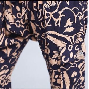 Loose fitting harem pants with an abstract floral print, many pockets (slit front, back, and cargo), drawstring at waist. Cropped. Stretchy waist Excellent condition Waist 15” Rise 13” Inseam 23” Viscose