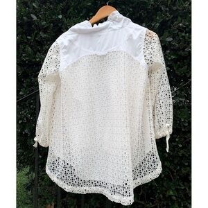 Super cute and boho windbreaker featuring an eyelet shell, windbreaker type material lining the bodice, drawstrings at the neckline, zipper front, two tiny pockets at the bust, 3/4 unlined sleeves with tie closure, and high low hemline.