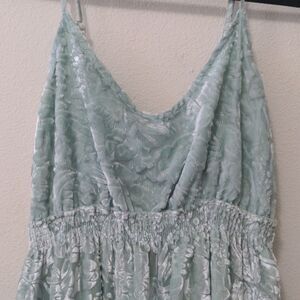 This preloved Anthropologie Hemant & Nandita Aqua Velvet and Gold Threaded Maxi Dress is simply gorgeous! The dress has an aqua velvet floral overlay with gold threading, a smocked waistline, ruffle tier at the hem, and adjustable straps. Perfect for Wedding guest, graduation, or date night.