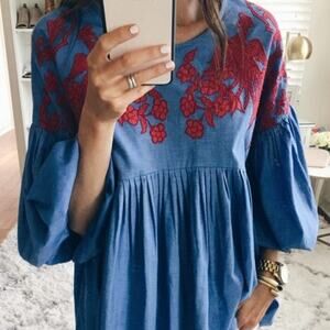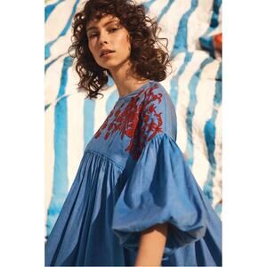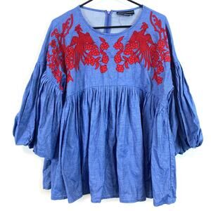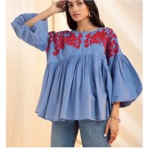 Anthropologie Hemant & Nandita Embroidered Balloon Puff Sleeve Babydoll Blouse Top Shirt in Blue & Red. Gathered empire waist shirt with puff sleeves. Back zipper. 100% Cotton. Great used condition.