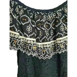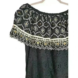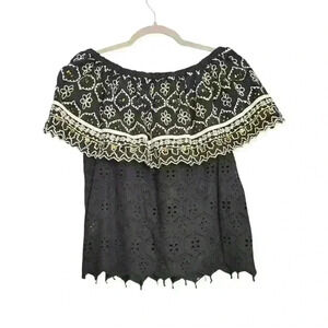 Embroidered Off-The-Shoulder Top in Black and White and Women's Size Medium. Cotton. Off-the-shoulder silhouette. Eyelet detail. Tasseled hem. Pullover style. Hand wash.