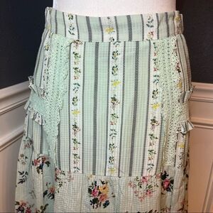 Gorgeous mint skirt (hitting just below the knee) that mixes floral prints interspersed with eyelet lace trims to create a cohesive but subtly intricate and textured design. Zip side with hook and eye to secure