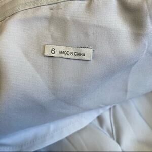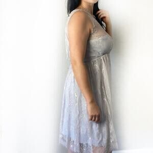 Excellent used condition! Gorgeous baby blue lace knee length dress. Fully lined with a sweetheart bust. Beautiful light gray/silver overlay of lace, giving an illusion of a high neck. Large keyhole buttoned back with an a-line silhouette. Empire waist with back zipper closure.