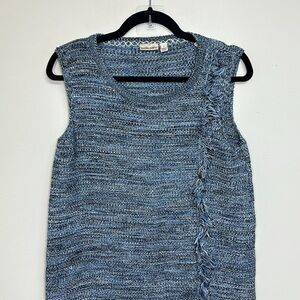 A marled knit sleeveless sweater dress with fringe detailing along side and bottom hem.