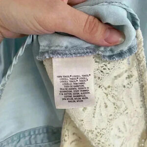 Tags Anthropologie, Holding Horses, button-down, denim shirt, lace details, mixed textures, boho-chic, feminine accents, casual elegance, vintage-inspired, Western style, relaxed fit, versatile layering, modern bohemian, statement piece, transitional wardrobe, light wash, soft denim, romantic detailing, cottagecore, everyday essential, breathable fabric, easygoing style, rustic charm, elevated casual, effortless style, timeless staple, laid-back luxury, artisanal vibes, casual layering, subtle detailing, Americana style
