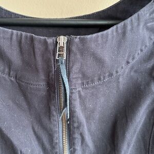 Sleeveless denim dress; crew neck; mini length; moderately thick fabric; front tie detail; exposed back zipper.
