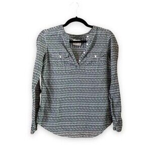 Anthropologie Holding Horses Navy Blue White Printed Popover Roll Tab Top Artsy Unique