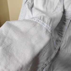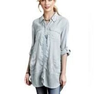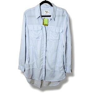 New with tags Anthropologie Holding Horses longline button-front shirt—wear as a tunic or lightweight overshirt. Airy rayon with mesh/sheer inset panels, roll-tab sleeves, chest flap pockets + hip slash pockets, and a curved shirttail hem. Easy, slouchy fit in a soft sky blue—perfect for layering with tanks, denim, or over dresses.