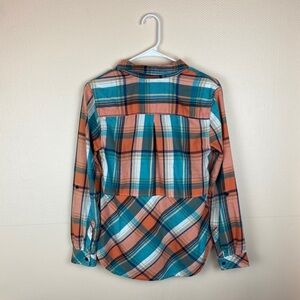 Anthropologie Holding Horses Orange & Blue Plaid Seamed Button Down Long Sleeve Flannel Top, some minor overall wash wear but still in good used condition, size XS. Bundle and save!