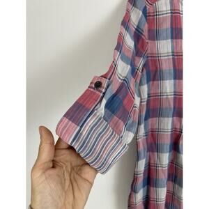 Anthropologie Holding Horses Plaid Tunic Top Popover Size 0 Pink Blue Tab Sleeve