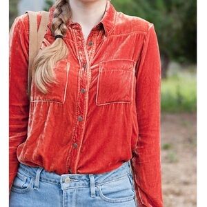 Anthropologie Holding Horses Rust Orange Crushed Velvet Silk Button Down Size S