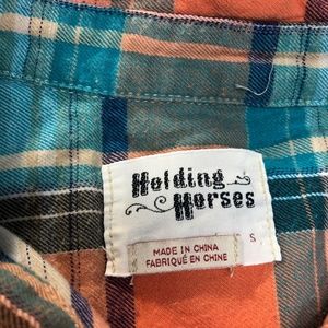 Cute and fun Holding Horses for Anthropologie Seamed Plaid Tunic blouse! Button up front blouse with a foldover collar neckline, in a blue orange and white plaid design. Full length sleeves with wrist button openings. In very good condition!
