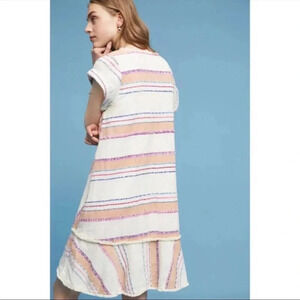 Short sleeve off white textured cotton dress with embellished stripes. V-neck. Drop waist with ruffle flounce hem. Raw seams. Lined. Made in India.