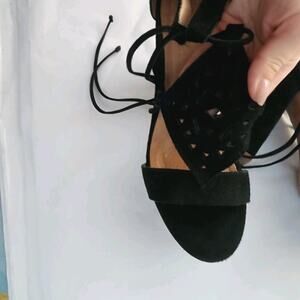 Anthropologie Howsty Mimosa Lasercut Suede Heels39 Black All Leather Wrap Ankle