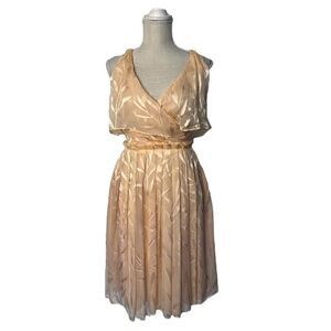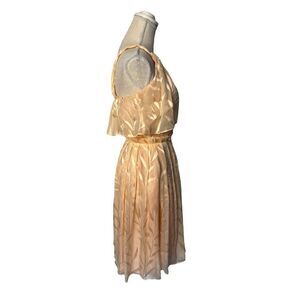 Anthropologie Hunter Dixon Peach Retro Ruffle Party Dress. Give off the most amazing Molly Ringwald vibes reminiscent of her unforgettable style in Sixteen Candles or Pretty In Pink. Absolutely love the prom ready look in this sweetly understated party dress. Features a wrap style bust, empire waistline with ruffle detail. Non adjustable straps. Zipper closure. Fully lined. Gorgeous peachy color with a chiffon like material that has foliage design in shines /sateen contrast. 100% silk. Dry clean only. Measurements in pictures. Designed by Hunter Bell & Jennifer Dixon.