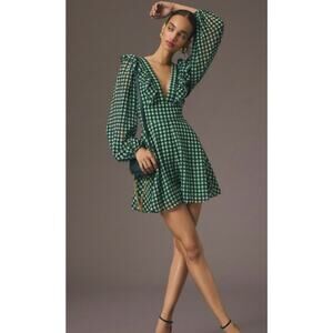 This Anthropologie Hutch romper is the perfect addition to your wardrobe! It features a flattering deep-V neckline, long sleeves, and a stylish green check pattern. The romper also has convenient pockets for your essentials. It is a size XS and in excellent condition.