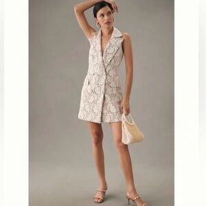 This Anthropologie Sleeveless Double-Breasted Lace Blazer Mini Dress from Hutch features a double breast buttoned front wrap closure with beautiful embellished pearl buttons, a wide notch point collar, white floral lace over a tan / nude background, and flap pockets.