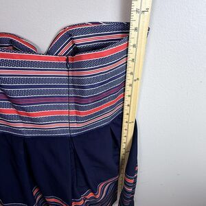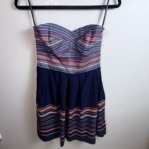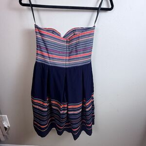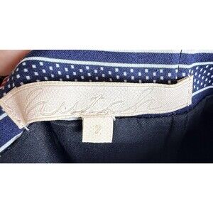 This Anthropologie Hutch Sweetheart Corset Mini Dress in size 2 features a striped pattern, sleeveless design, and a sweetheart neckline for a romantic look. The dress has a zip closure and comes in a stylish navy blue color. Made from polyester knit fabric, it is perfect for various occasions such as travel, parties, or casual wear. With its fit & flare style and mini length, this dress is ideal for summer, fall, and spring seasons, making it a versatile addition to any woman's wardrobe.