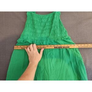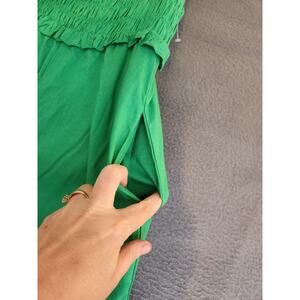 The NWT Anthropologie If By Sea Kelly Green Jumpsuit in size L is a stylish and comfortable one-piece outfit perfect for various occasions such as travel, parties, or casual wear. Featuring a square neckline, sleeveless design, and smocked detailing, this jumpsuit in a coastal Kelly green color offers a relaxed fit with wide-leg styling. Made from a blend of viscose, linen, and linen blend fabric, this jumpsuit is designed for comfort and breathability, ideal for wearing during the summer, fall, or spring seasons. With its beachy and tropical theme, this Anthropologie jumpsuit is sure to make a statement wherever you go.