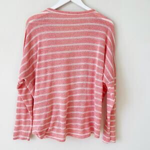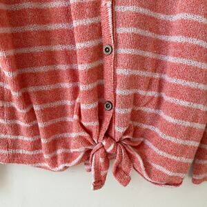 This item is in excellent condition with no flaws found. It has a full button frot with an option to tie at the waist. It has long sleeves with drop shoulders. It is salmon pink with white horizontal stripes.