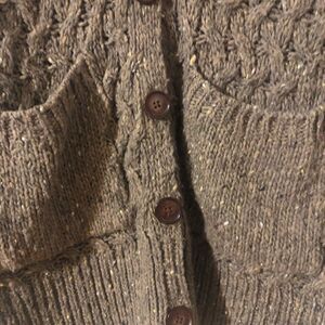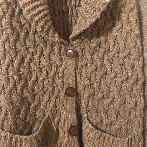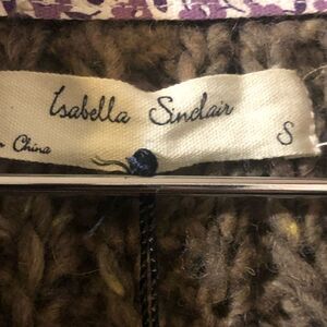 Anthropologie Isabella Sinclair brown chunky knit cardigan sweater with shawl collar. Brown with flecks of black and cream. Big buttons for front closure. Deep pockets. Women’s small. Blend of wool, acrylic, viscose and alpaca. Extra button included. Preowned EUC