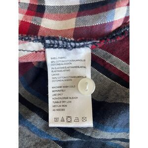 Features: plaid, navy, blue, red, faux wrap, V-neck, gathered waist in back, midi, handkerchief hemline, lined, side zipper, plaid wrap, tartan, elastic back, button detail on sleeves, cotton.
