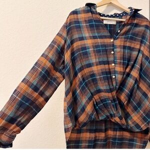 Anthropologie Isabella Sinclair Plaid Twisted Button Down Blue Orange S Womens
