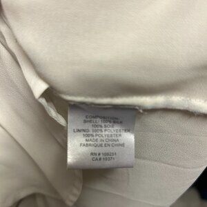 Silk summer dress with a flattering midi silhouette. Looks great as is or with a belt. Outer fabric is 100% silk and lining is polyester. Small blue stain shown in the 7th picture.