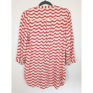 Features and description: swizzle stripe tunic; button front; dropped waist; 3/4 sleeves; red and cream