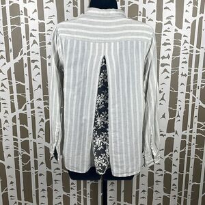Anthropologie Isabella Sinclair Ivory & Grey Striped Button Down Shirt w Lace Panel Back sz S. Features lightweight semi-sheer ivory & grey 100% cotton striped and textured fabric, roll tabs on the sleeves, contrasting floral print fabric lining the collar and cuffs, ivory floral lace panel insert across back. Gently worn and laundered with a missing button on the right sleeve for the roll tab (see pic) but there is a spare button on the tag so this is an easy fix if you sew.