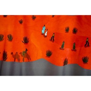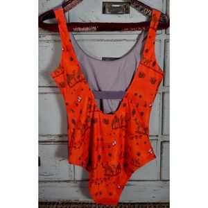 This swimsuit is a piece of art. It was created by the Norwegian artist Isabelle Feliu. The orange is complimented by a dark grey middle band & straps. It has a full bottom & removable pads.