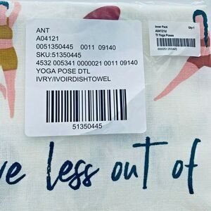 Add a touch of whimsy to your kitchen with this lovely Anthropologie dish towel! Featuring charming illustrations of ladies in various yoga poses, these ivory-colored towels are as delightful as they are functional. Made from soft and absorbent cotton, they're perfect for all your kitchen needs.