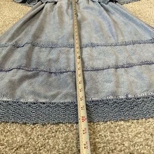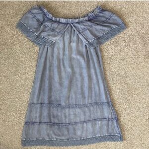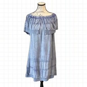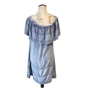 Here is an Anthropologie J. Gee BOHO Chambray Denim Crochet Tiered Off Shoulder Dress M in EUC