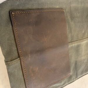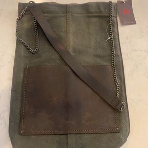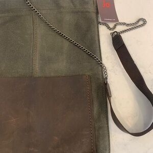 New with tags! Very cool bag in olive canvas & distressed brown leather. Envelope tote with chain & leather strap, 20 inch drop for crossbody wear. Top interior leather optional handles. Two inside pockets. Outer bag measures 15”x11” Never carried.