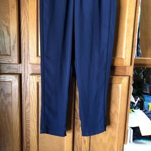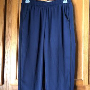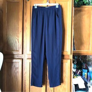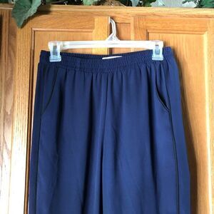 Features: Mid rise, pull-on, elastic waist, soft lightweight solid dark blue semi-sheer polyester fabric, 2 front pockets, black trimmed accents, ankle length