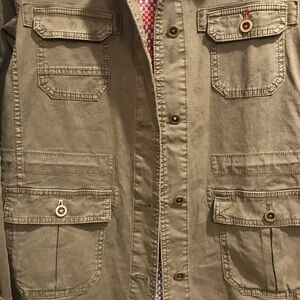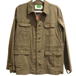 Anthropologie Army Green Cotton Linen Blend Utility Jacket with Lambswool Blanket Knit Back