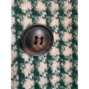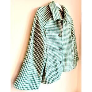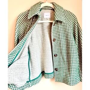 Anthropologie coat by Greylin, size small. Called the “Femme Swing Jacket,” this cropped coat is constructed with a beautiful and super soft green, cream and metallic silver houndstooth fabric that is subtly textured. It features brown tortoise shell buttons, side seam pockets lined in a satiny green fabric, wide three-quarter length sleeves, and a slight “swing” silhouette. Perfect for chilly or downright cold days when you want to add a stylish finishing touch to your outfit and don’t want the bulk of a heavy winter coat (and won’t be outside for too long time!). It’s warm and cozy, but not lined.