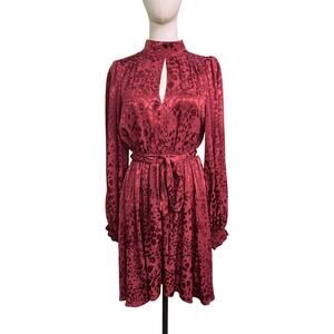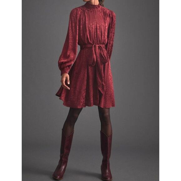 Anthropologie Jacquard Leopard Dress Burgundy Open Back Tie Waist Womens S Party