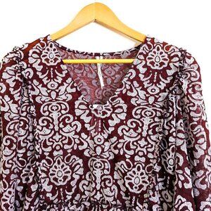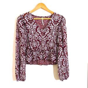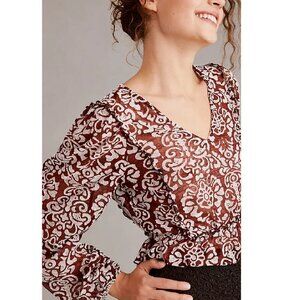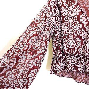 Boldly decorated with ornamental motifs, this ruffled-hem blouse lends timeless charm to your new season wardrobe. Framed with billowy sleeves and a feminine V-neckline, it's the perfect ensemble for showing off a chunky necklace and statement drop earrings to match.