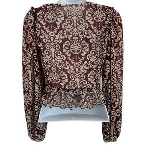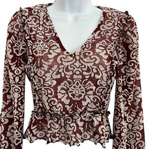 Anthropologie Jacquard Peasant Long Sleeve Cropped Top XXS Wine Boho Festival