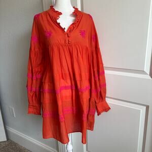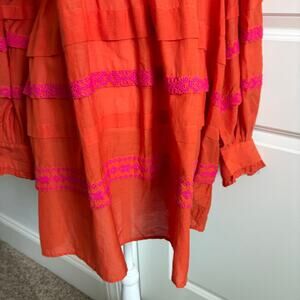 Anthropologie Jacqueline Embroidered Button Down Tunic Orange Sheer S Oversized